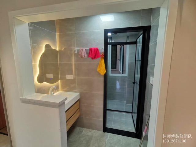 公卫是三分离的,洗手池外移,更方便使用。镜面灯是卡通造型的,非常可爱,还带有藏光,很好看哦。墙面安装了毛巾架,很实用。边上是半墙设计,不会阻挡光线。