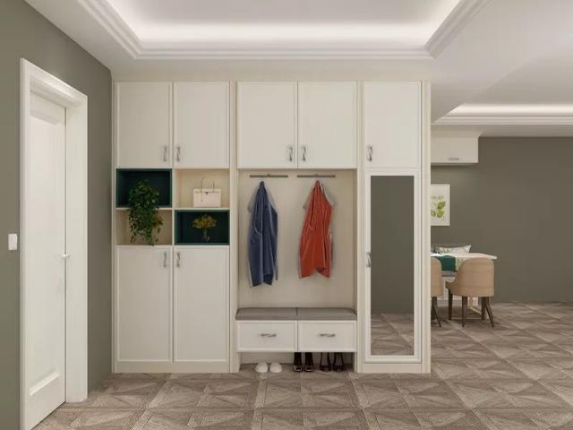 入户柜处巧设穿衣镜,出门前照照镜子,整理着装,检查妆容,以防自己的小粗心,比如忘记戴手表、忘记拿围巾、忘记涂口红等,让你自信出门,还能起到美化空间效果。