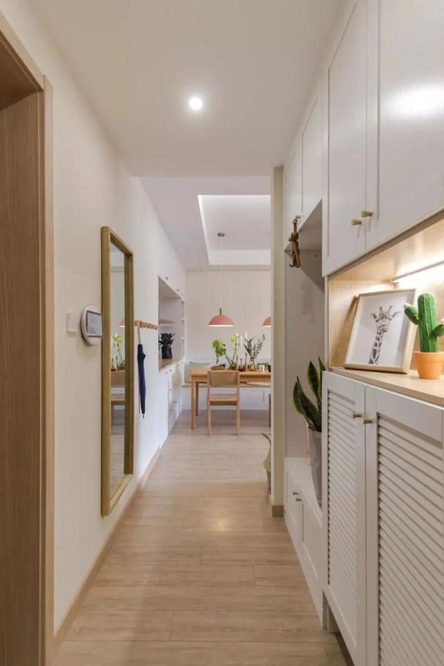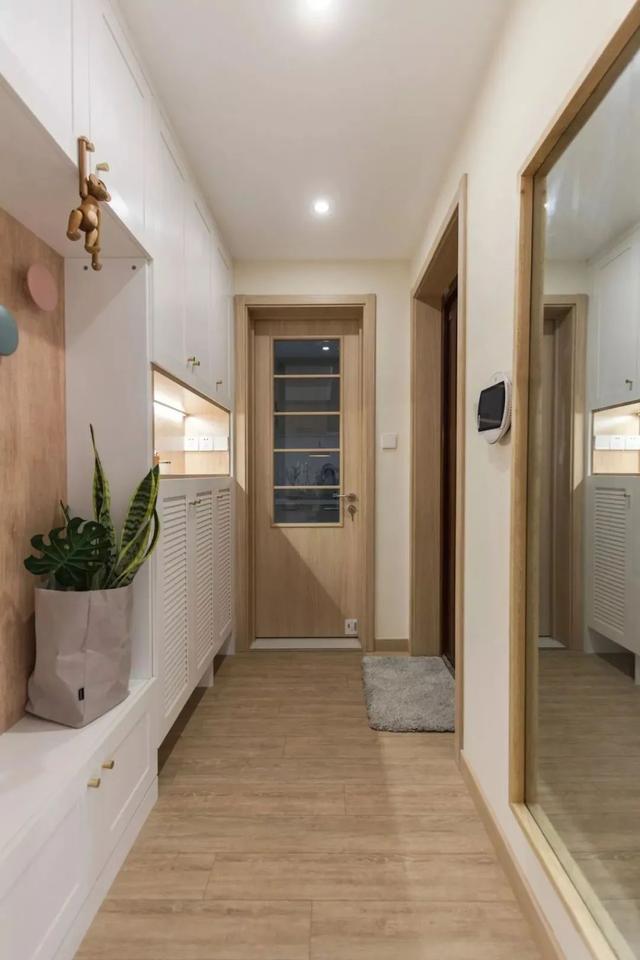 ▲ 玄关入户,温暖诗意的室内气息扑面而来。门厅木饰面白色鞋柜体,延伸出换鞋区域,衣帽钩、全身镜,带出玄关的人性化设计。