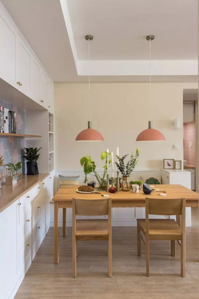 ▲ 餐厅与客厅保持相同格调,通过原木餐桌椅本身质感,来营造自然清新的感觉。两盏粉色造型简约的餐厅吊灯,使得整个空间明亮而温暖。