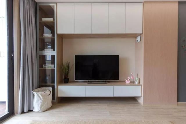 ▲ 悬空的电视柜给客厅增添了几分高级感,白色结合原木色的电视柜体墙简雅大方,左侧设计玻璃柜门,防尘又体现出质感。