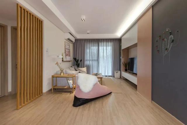 ▲ 原木打底的空间,木质的温润质感让家清新自然。简洁无主灯设计的吊顶,搭配浅黄色的乳胶漆墙面,粉色懒人沙发点缀空间。