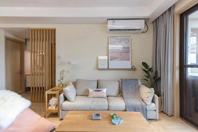 ▲ 客厅治愈系的色彩搭配,布艺沙发颜色柔和,自然静美。木质格栅屏风延长沙发背景墙,同时隔开区域。背景墙装饰画与串灯,营造温馨氛围。