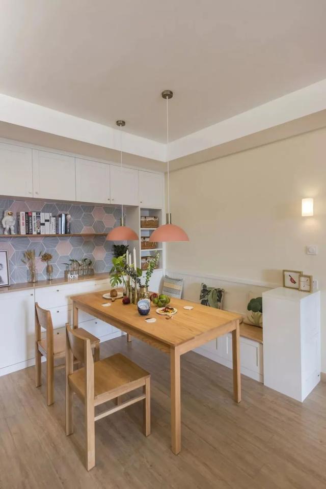 ▲ 餐桌一侧靠墙设计卡座,将餐边柜打造成背景墙,中部留空,加装置物层板,收纳实用性更强。L形空间布局小资格调,就餐氛围倍感温馨!