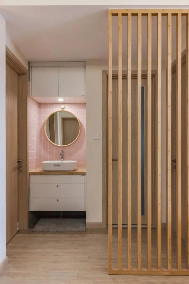 ▲ 格栅屏风自然分隔区域,客卫生间干湿分区。浴室柜与台盆柜简单大方,抽屉式收纳设计人性化。粉色格纹背景搭配圆形挂镜,可爱又时尚。