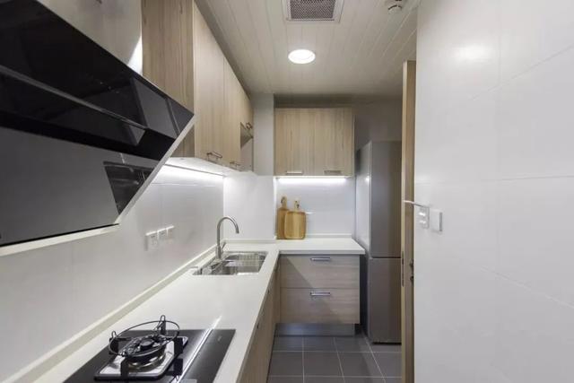 ▲ 厨房空间,米色木纹橱柜搭配乳白色台面,简洁明亮。接近自然的木纹肌理,减淡了厨房的油腻气息。吊柜底部留有灯条,让烹饪没有死角。