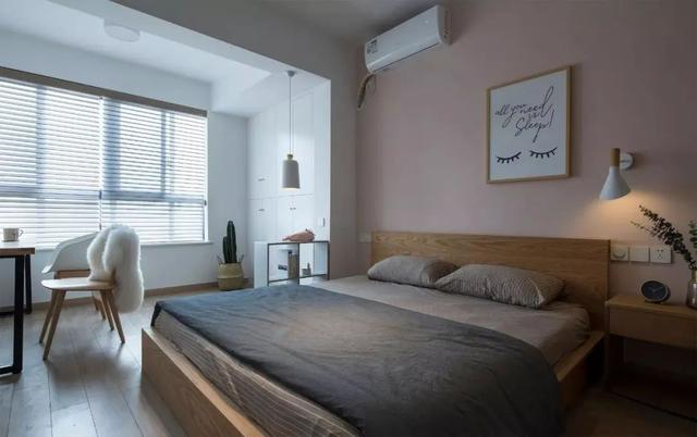 ▲ 柔和的粉色墙面,一副简框画与壁灯做点缀,简约不失雅致的原木床体,充满沉静慵懒。纳入休闲阳台空间,改善房间采光与通透性。
