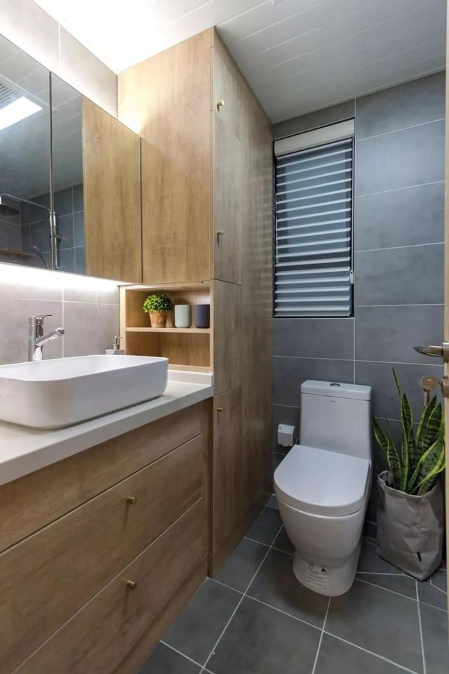 ▲ 主卫空间,原木做的台盆柜连接收纳竖柜,温暖的原木色连体浴室柜与灰色空间相碰撞,给冷调的浴室空间增添温度。白色拉槽吊顶,拉伸空间。