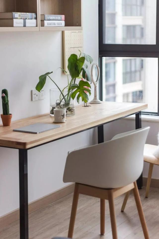▲ 主卧阳台设计出私人阅读角,简单的木质书桌椅,洋溢着悠然自在的生活气息。搭配墙上的开放式书架,空间温柔而惬意。