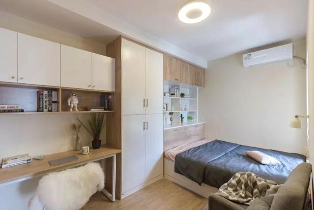 ▲ 奶油色系的空间,靠墙做榻榻米床架,连接设计出系统柜,方便收纳置物。一张书桌与吊柜书架,构出一个兼做书房与临时卧室的房间。