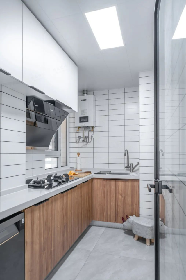 在选材用料方面,厨房的地板用防滑瓷砖或通体砖,吊顶尽量选择铝扣板吊顶,方便拆卸以便后续的清洁和安装。