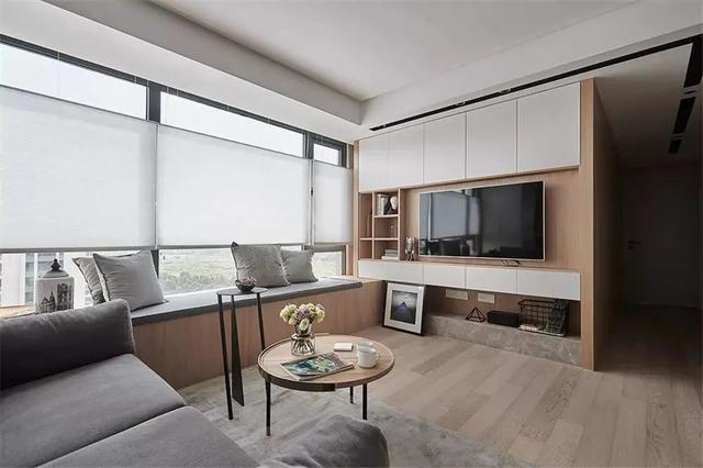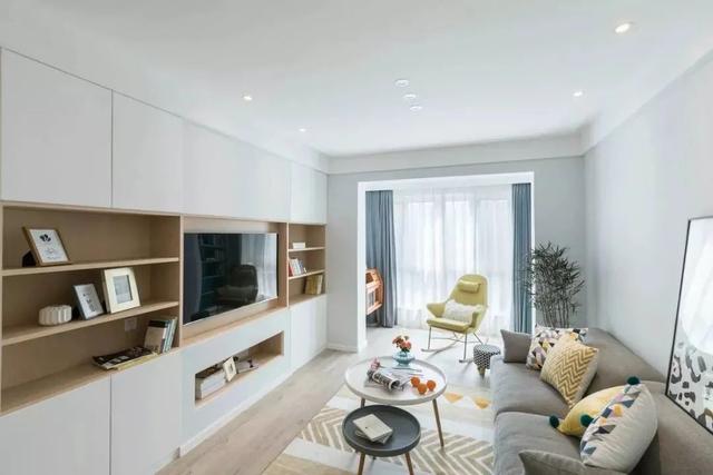 电视墙书柜:客厅定制了一整面墙的收纳柜,将电视柜和书柜组合设计,一举两得。