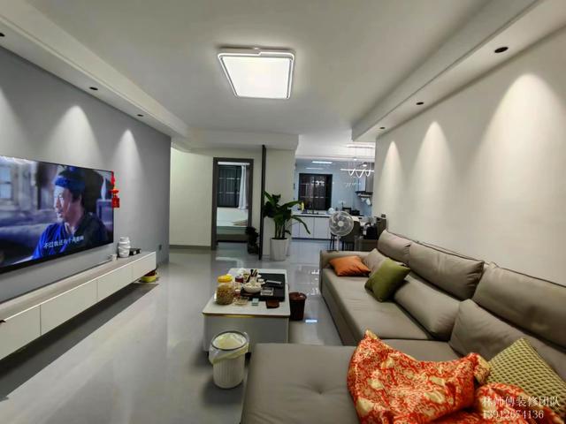客厅很宽敞,灰色沙发舒适轻奢,两边的山丘灯,唯美浪漫。雾蓝的电视背景墙,清新自然。