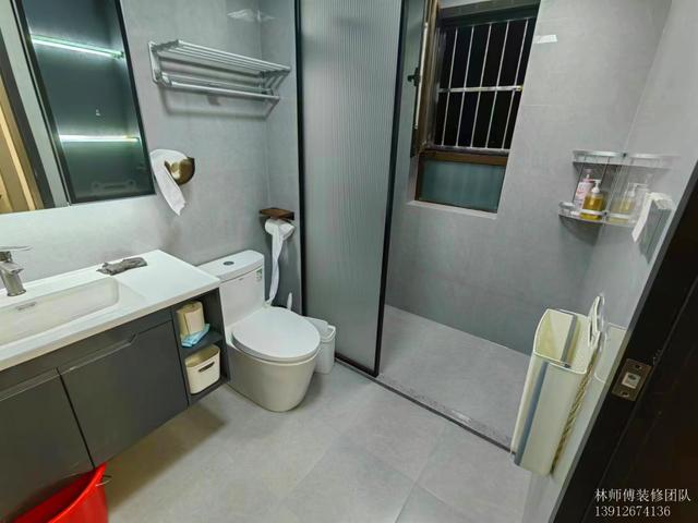 洗手间干湿分离,方便清洁打扫,还有镜面柜、各种收纳架,将整个洗手间都整理的干干净净。
