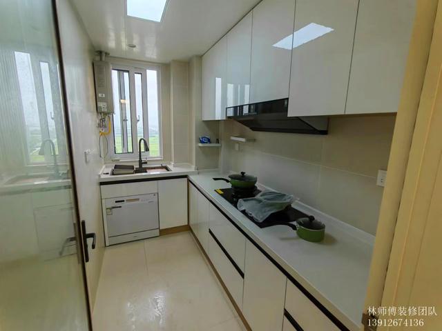 L型的厨房设计,上下吊柜,收纳充足。白色的台面+橱柜,看着非常的干净利落。