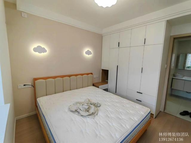 主卧,皮粉的背景墙搭配云朵壁灯,烂漫温馨,再辅以舒适的床品,给主人营造了一个高质量的睡眠环境。