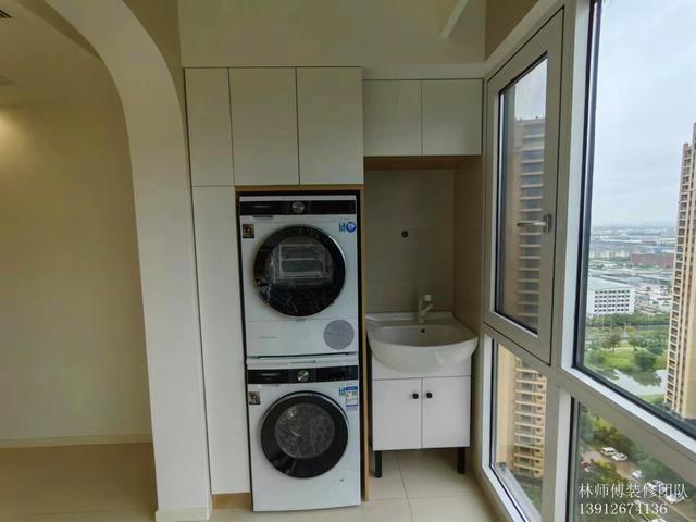 阳台设计弧形,看上去更柔和。洗烘机收纳进柜子里,整齐统一。