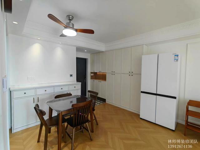 往里走,首先经过的是餐厅空间,木色餐桌、复古风扇灯,构成了非常温馨的用餐环境。