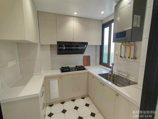 米白色厨房干净整洁。u型设计,增加储物空间。大单槽使用起来也是非常方便的哦。
