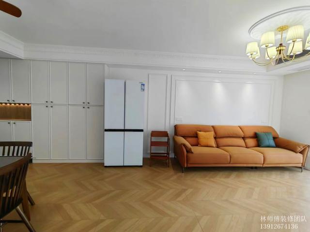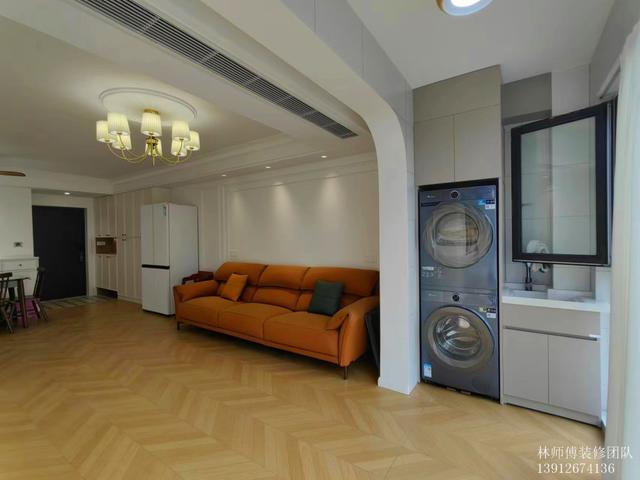 客厅和阳台打通,通铺地板,整体统一。而且随着阳光的摄入,让整个空间看起来更加通透明亮。洗烘机内嵌设计,美观性更强。顶部的柜子也能增加家里的收纳能力。