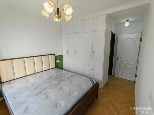 主卧一抹绿色的木饰面设计,让人眼前一亮,非常精致。软包的美式大床,舒适且温柔。