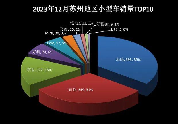 2023年12月,海鸥、海豚、缤果、好猫、Polo、MINI、飞度、钇为3、好猫GT、LIFE,销量分别为393辆、349辆、177辆、74辆、57辆、30辆、20辆、11辆、9辆、5辆,位居A0级小型车销量前十。