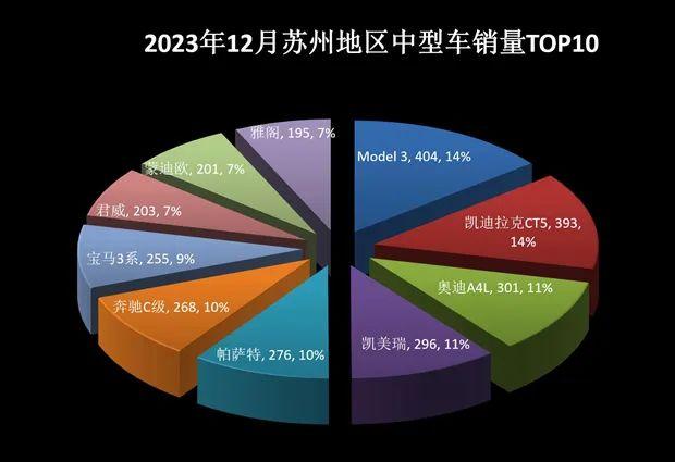 2023年12月,Model 3、凯迪拉克CT5、奥迪A4L、凯美瑞、帕萨特、奔驰C级、宝马3系、君威、蒙迪欧、雅阁,分别以404辆、393辆、301辆、296辆、276辆、268辆、255辆、203辆、201辆、195辆,位居B级中型车销量前十。