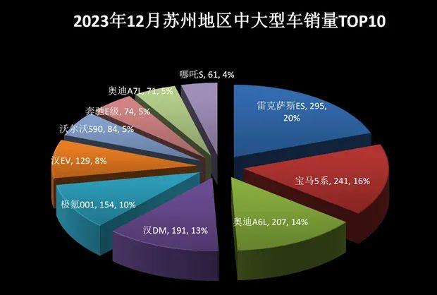 2023年12月,雷克萨斯ES、宝马5系、奥迪A6L、汉DM、极氪001、汉EV、沃尔沃S90、奔驰E级、奥迪A7L、哪吒S,分别以295辆、241辆、207辆、191辆、154辆、129辆、84辆、74辆、71辆、61辆,位居C级中大型车销量前十。