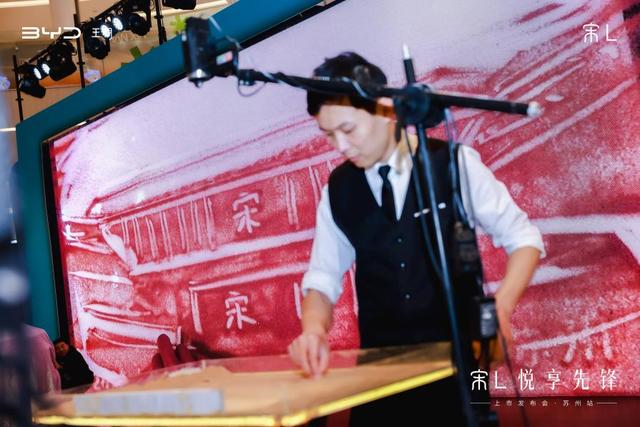 随后,沙画师现场沙画绘制,展现宋L车型亮点,一沙一世界,绘制出宋L的先锋之美,满配颜值,为新车揭幕。