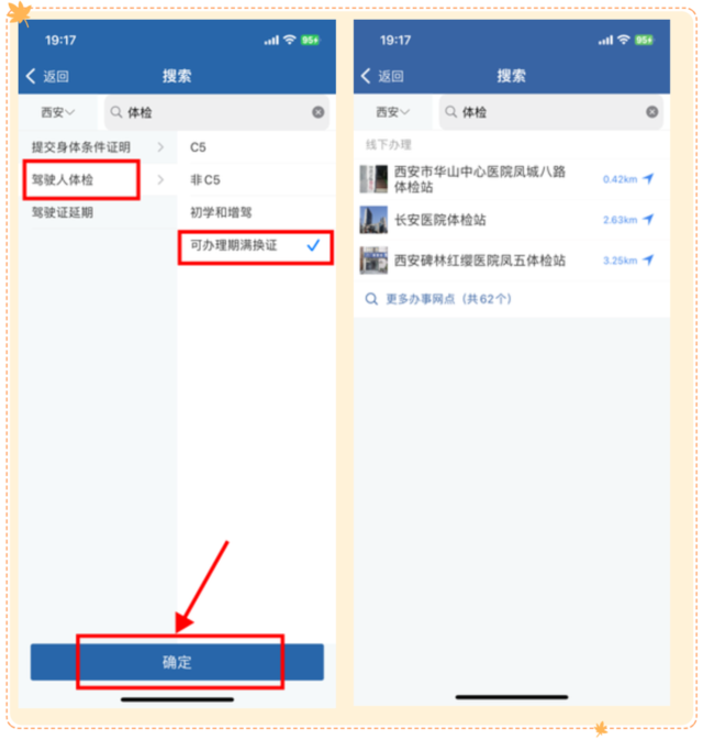 在交管12123 APP首页顶端搜索栏,搜索【体检】,点击【驾驶人体检】,再点击【可办理期满换证】,然后点击【确定】就会出来很多你附近的体检医院,选择离你最近的。