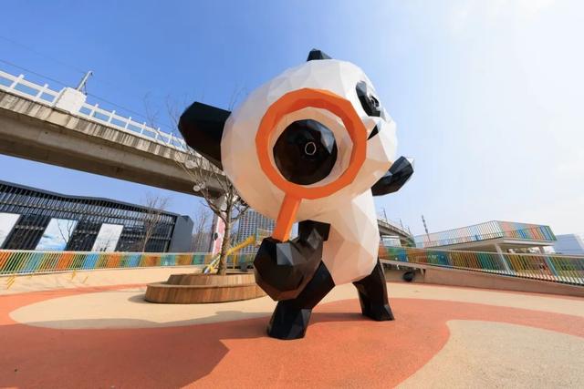 为了充分利用有限的空间,通过丰富的竖向变化,将不同功能的设施布置在不同的高度上。入口处的彩虹渐变色环形廊桥引人入胜,结合立体熊猫雕塑,共同组成了“熊熊打卡点”,游人可以选择在地面上与熊猫打卡合影,也可以选择沿着环形步道而上,从高处俯瞰公园,丰富的高度变化使得整个乐园呈现出层次感和趣味性。