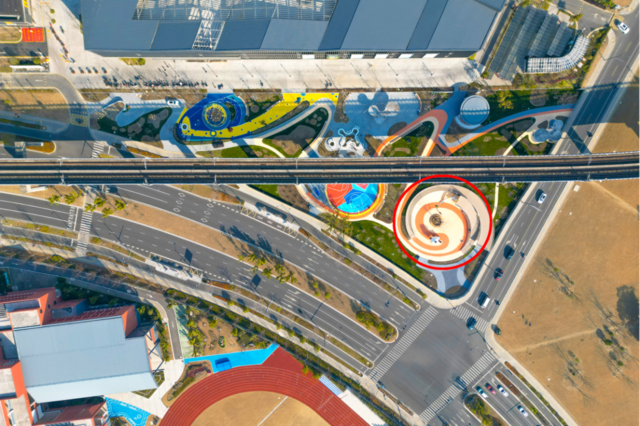 ▲“长颈鹿”儿童游乐区和圆形篮球场位于公园中间区域