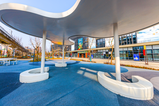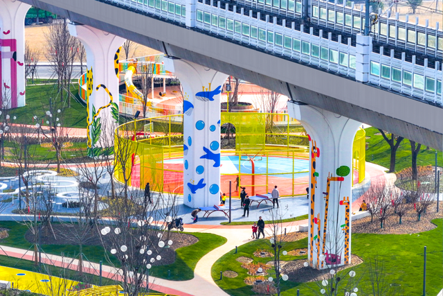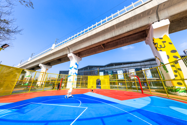 缤纷运动乐园建设时以“激活轨交11号线桥下空间”为出发点,通过场地丰富的竖向变化,设置了环形步道、森林乐园、缤纷游乐场、活力篮球场等极具童趣色彩的功能设施,同时对厚重的轨交立柱进行艺术喷绘,从而变身为儿童活动空间,成为小朋友们嬉戏玩耍的游乐园;变身为缤纷运动空间,成为市民们强身健体的运动场;变身为色彩丰富的林下空间,成为市民们乘荫纳凉的好地方。