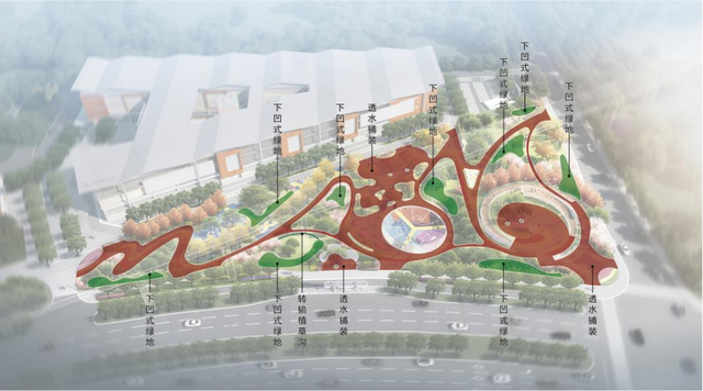 公园积极践行海绵城市建设理念,设置了透水铺装、下凹式绿地、转输植草沟3种类型的海绵设施,年径流总量控制率目标取值85%,设计降雨量34.0毫米,综合径流系数目标取值0.45,面源污染削减率目标取值为70%。