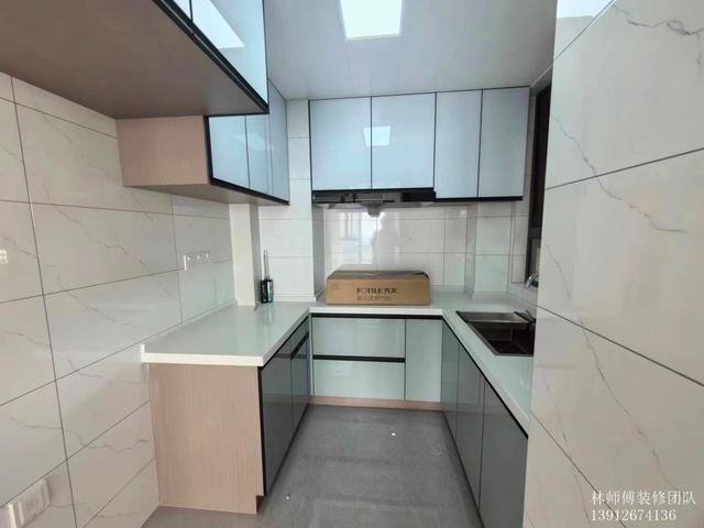 厨房面积不算大,u型设计能大大增加厨房的收纳能力。浅色的设计,也给人一种干净明亮的感觉,即使没有采光,也依然通透清爽。