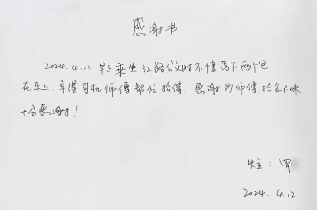 4月12日,公交32路驾驶员沙海峰在车内捡到金项链和现金等贵重物品,及时归还失主,乘客写信表达感激之情。