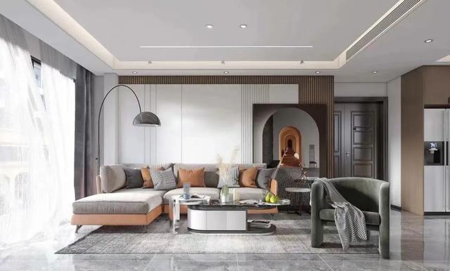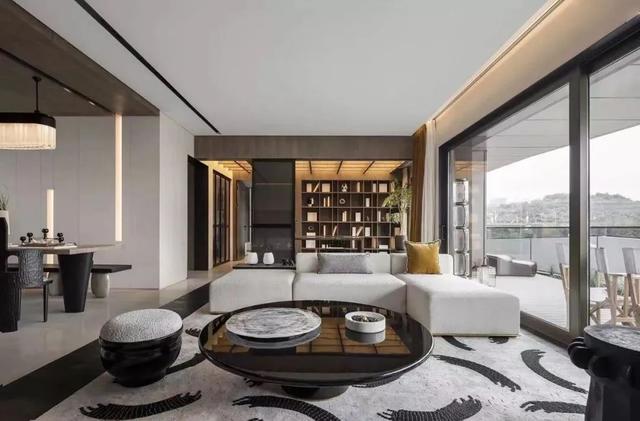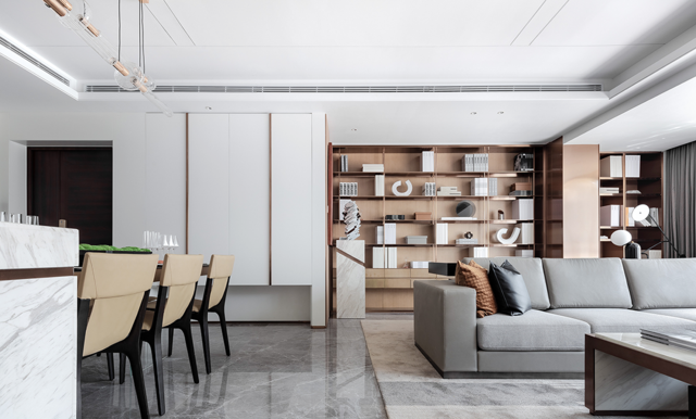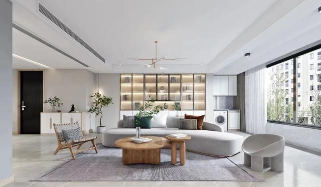 将两个空间合并为一个空间,减少实体墙面的阻隔,可以让空间更大。例如客餐厅一体设计,将空间打穿,大面积的开阔领域呈现在眼前,整体的公共区域看起来就更加宽敞大气。如果真的喜欢分隔空间的话,建议用玻璃隔断或者半开放式的柜体,既能收纳,又能划分功能区,一举两得。