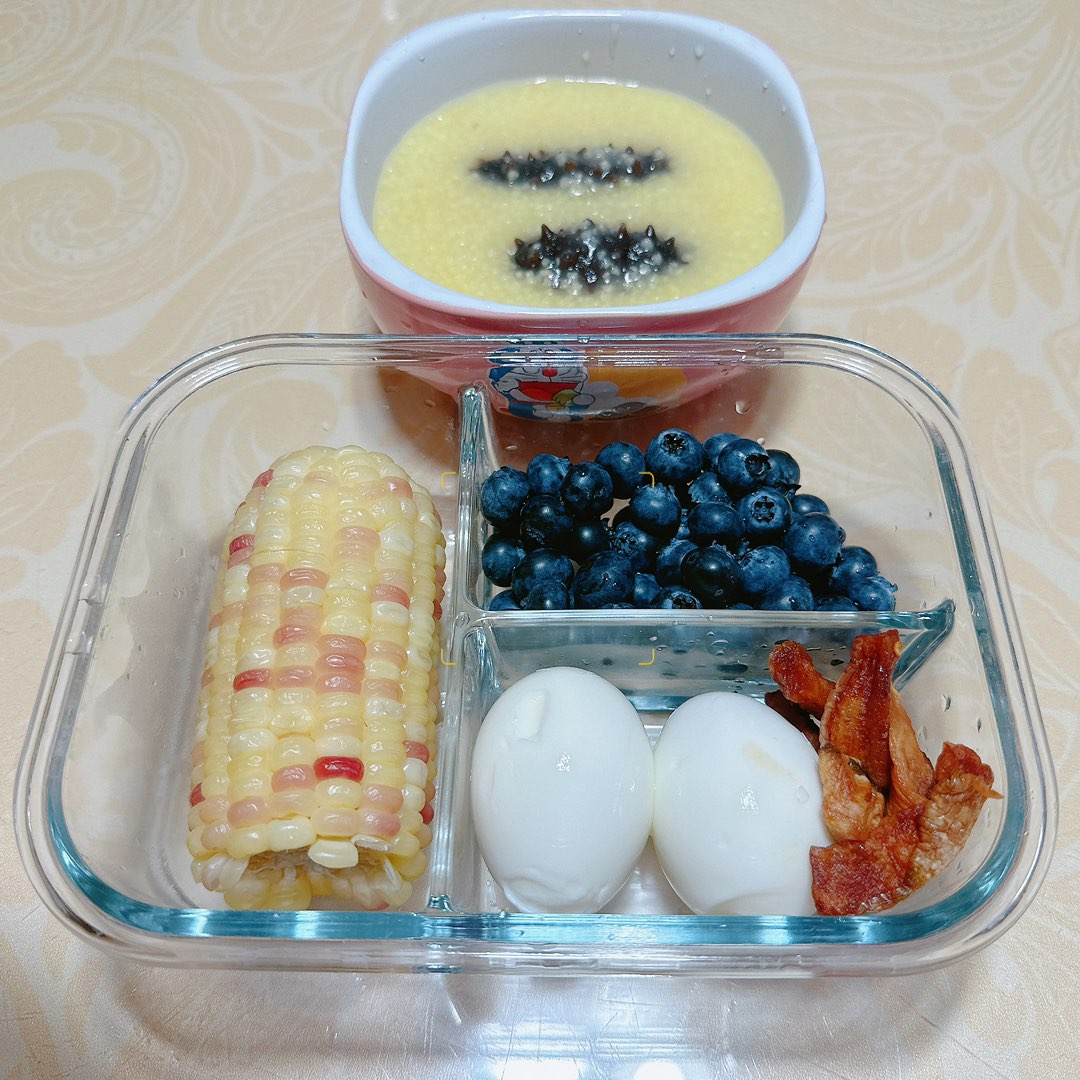 给老妈准备的玉米、鸡蛋,白煮蛋,我妈也重口味,她不太爱吃粥,拿了几根瓜条给她下粥。