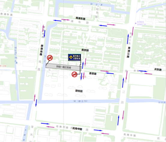 施工期间该区域全线封闭,设置围挡进行隔离,设置相应的交通设施和标识标牌。期间,机动车与非机动车在施工区域内均无法通行,可选择绕行路线:善景路——黄浦江路——南浦路——景唐南路