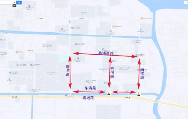 由东向西机动车可选择绕行:南浦路——景唐路——善景路。