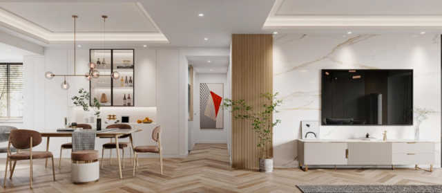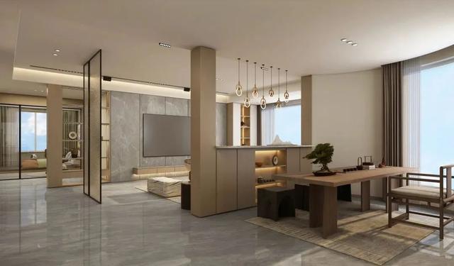 家居设计通过虚实、隐显等相互作用,让空间与空间间通透的隔断使空间有一定的关联,这就是空间形态的虚实结合,它常常用于玄关、客厅等空间的划分中,有屏风,帷幔,珠帘,玻璃等。