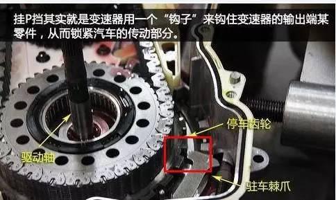 因为P挡是停车挡,挂入P挡后锁止机构锁止变速箱,就是说它里面有个挂钩,是一个驻车棘爪或者叫锁止齿轮,用来实现“停”的作用。