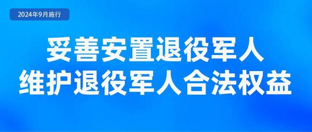 《退役军人安置条例》自2024年9月1日起施行。《条例》指出,退役军人为国防和军队建设做出了重要贡献,是社会主义现代化建设的重要力量,国家关心、优待退役军人,保障退役军人依法享有相应的权益,全社会应当尊重、优待退役军人,支持退役军人安置工作。《条例》明确,对退役的军官,国家采取退休、转业、逐月领取退役金、复员等方式妥善安置;对退役的军士,国家采取逐月领取退役金、自主就业、安排工作、退休、供养等方式妥善安置;对退役的义务兵,国家采取自主就业、安排工作、供养等方式妥善安置;对参战退役军人,担任作战部队师、旅、团、营级单位主官的转业军官,属于烈士子女、功臣模范的退役军人,以及长期在艰苦边远地区或者飞行、舰艇、涉核等特殊岗位服现役的退役军人,依法优先安置。
