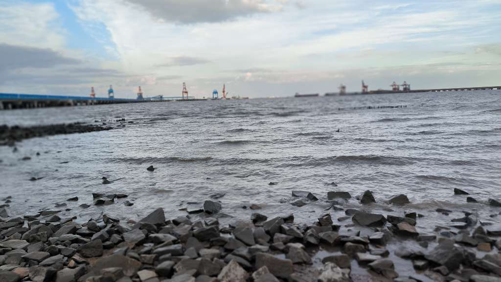就一个大公园,晃荡一圈出来。找坛友推荐抓小蟹的地方,本以为很难找,其实往东开一点点路就到尽头,再往南开,到玖龙纸业码头的桥下,应该就是了,换上凉鞋,提上桶,去翻石头逮蟹啦