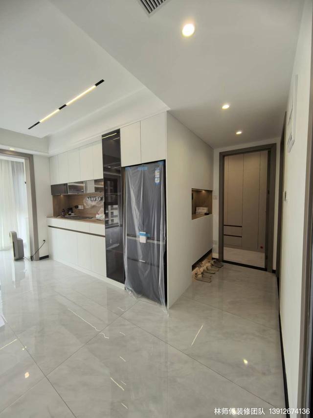 这是苏州蔚蓝四季花园小区一套装修实景案例,建筑面积140平米,大横厅,四房两厅户型,全屋以灰白黑为主,无主灯设计,打通阳台,通铺地砖,使得整个空间非常的宽敞明亮。