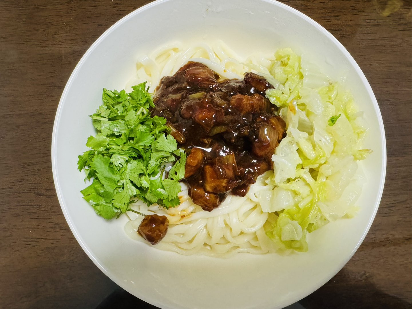 今天中午无意中刷到一个北京博主做简易版老北京炸酱面,看着不难,想着晚上就想吃点简单的,送完孩子直接去超市买食材。买了一小块五花肉,一根大葱,一瓶黄豆酱,一把手擀面。多放油才香,两颗八角几片生姜,把五花肉切丁,肥的先煸黄,再下瘦肉丁,煸一会放了半瓶黄豆酱,大概400g,放一半大葱粒,放点老抽上个色,再放点冰糖代替甜面酱,小火炸炸炸,炸到酱咕咕冒泡,差不多半个小时,再放剩下一半大葱粒,稍微再炸下就出锅。看博主炸酱外还准备了大白菜和芹菜丁,我就准备了白菜和香菜末。天哪,不吃不知道,一吃吓一跳,味道就在我的味蕾上,又香又好吃的,全家都说好吃