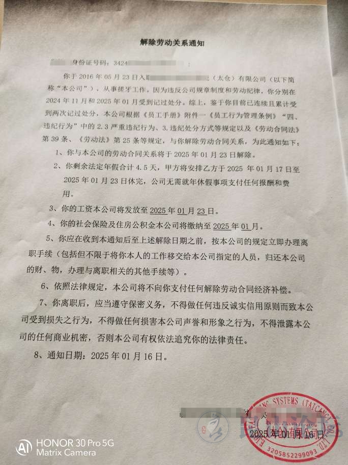 简单说下我的问题,在这家外企公司工作还差4个月满九年。我是公司生产一线的技术工,我们领导近期给我开了两个公司违纪处罚单。一个是11月底说我产品没有认真对待(一款产品尺寸说我没有测量到位,其实一直是一个Bug,那款产品测量一直没有规范化,没有作业指导全部都是靠员工自己操作)第二个违纪是这个月9号(公司有个改革措施5天8小时制改成特殊工时,周六日全部按1.5倍计算,虽然加班基数上调了一点,总体算下来是亏的。还有扣除晚上加班0.5小时原因是吃饭没有工时,可是机器是没有停的,吃饭是交接班吃饭的)我跟我们班组一个老师傅在讨论这个问题,一个同班组同事神经大条气势汹汹过来指责我要打我的样子。之前和他对这件事情有过分歧。这样事情闹大领导知道了又记过。处罚单我有签字,现在就是这点。老祖宗一句老话:人在屋檐下不得不低头,第一个处罚后领导七个周六日没让我加班。签字时就是让你签等着你签,意思就是签也得签,不签也得签。现在公司以两次记过处分为由解除劳动关系,没有赔偿。16号早上下夜班让我不要来公司,安排休剩余年假到23号终止