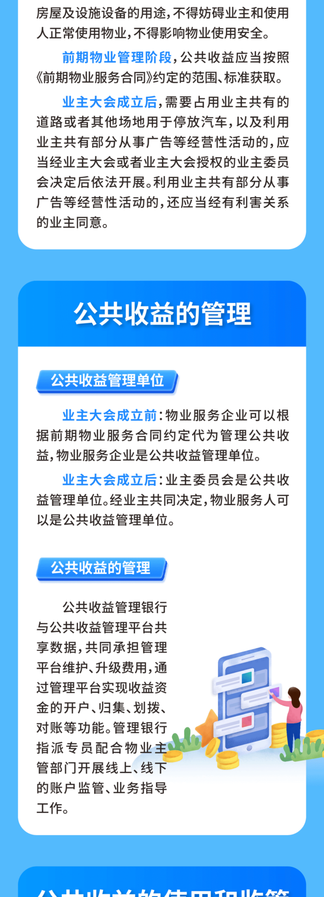 小区公共收益的归属、管理和使用关系到居民切身利益。去年以来,我市实施规范物业管理行为提升物业服务水平“十项措施”,持续聚焦公众广泛关注的公共收益,通过规范账户管理、开发线上平台、完善收支流程等方式进一步加强公共收益资金监管,加强对物业企业、业委会(物管会)等管理主体的指导监督,推动公共收益数字化、可视化、规范化管理。