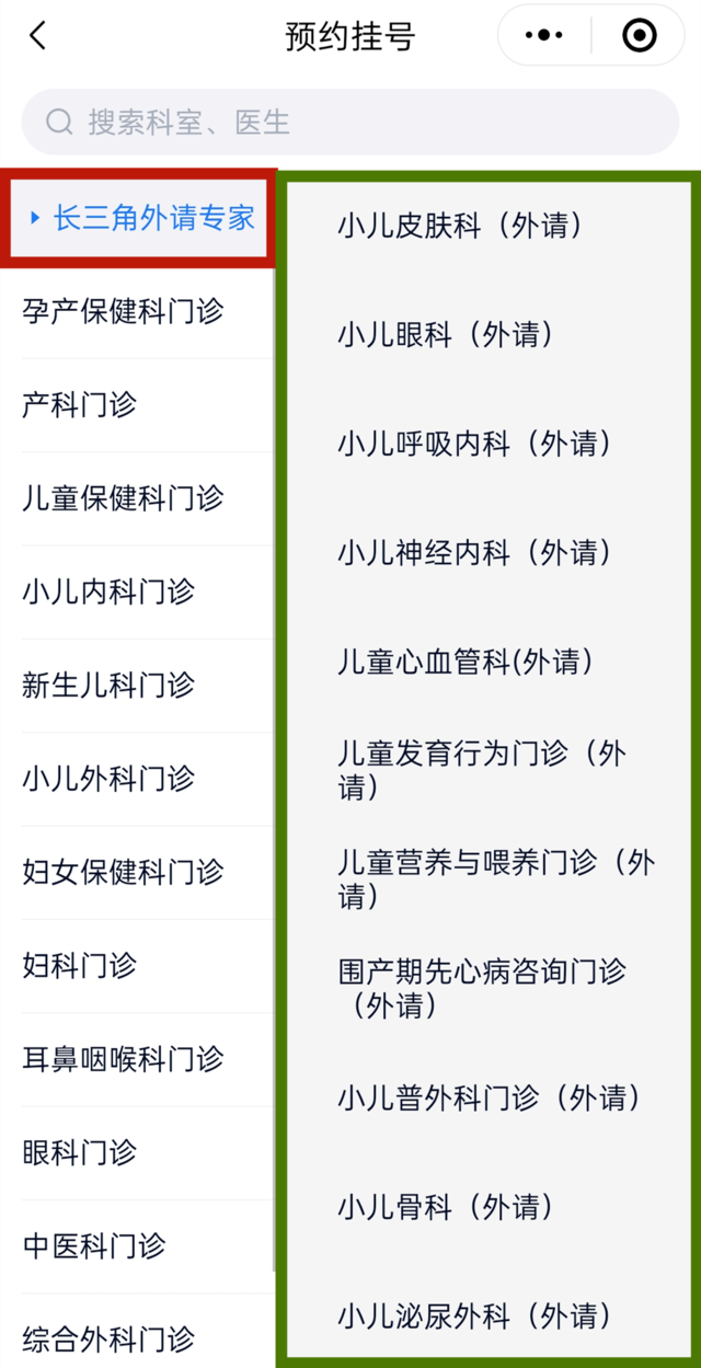 进入“预约挂号”后,点击“长三角外请专家”进行相应科室预约