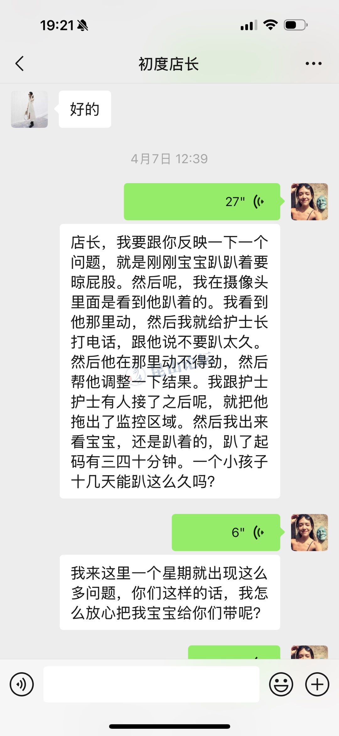 当时宝宝出生10天,脐带还没掉,她们让宝宝晾屁屁,让宝宝趴着(事后我问了出生医院的医生,宝宝现在这个情况,是不建议趴睡)然后护士长把宝宝趴着的图片发在关于我的关爱群里,当时我就直接在群里说了不能趴太久,护士长也回答了“好的”(当时已经趴半个小时了)然后我看到房间监控里面宝宝趴着,满脸通红一直在哭,也没有护士理,我就很着急打电话给护士站,让她们尽快安抚宝宝并且别在趴睡了,结果护士站的护士嘴上答应的很好,下一步就直接把宝宝移出我们房间可以看见的监控范围。我在605房间离护士站很近,我就去看了护士站的大监控,我看到护士并没有调整宝宝的姿势,也没有人安抚宝宝(当时趴睡时间已经超过45分钟了)对于她们这种欺骗客户的行为,没有哪个当妈的能看到自己的宝宝被这样虐待,我在护士站叫护士出来解决问题,没有一个人敢出来正面解决问题。这种情况我只能直接跟她们店长沟通,护士长过来跟我解释说,我宝宝这种情况可以趴睡一个小时没问题的。这个护士长她这样的说法让我对她的专业度表示质疑,我也不知道她是怎么当上这个护士长的。对于她们这种无视客户意见,欺骗客户的行为,已经把我对她们仅有的一点信任都消失殆尽。